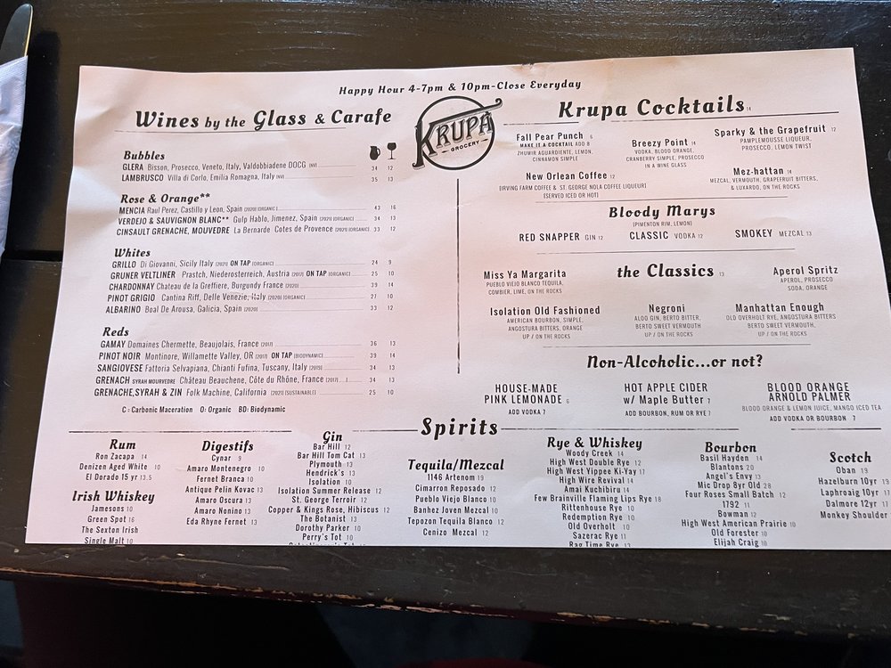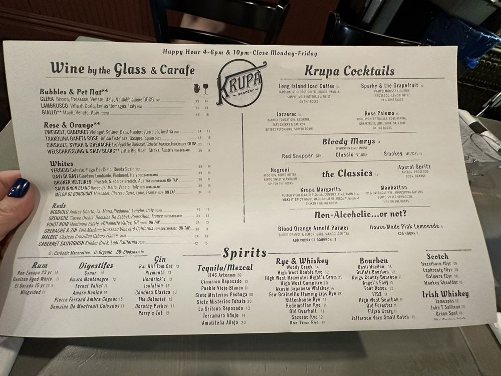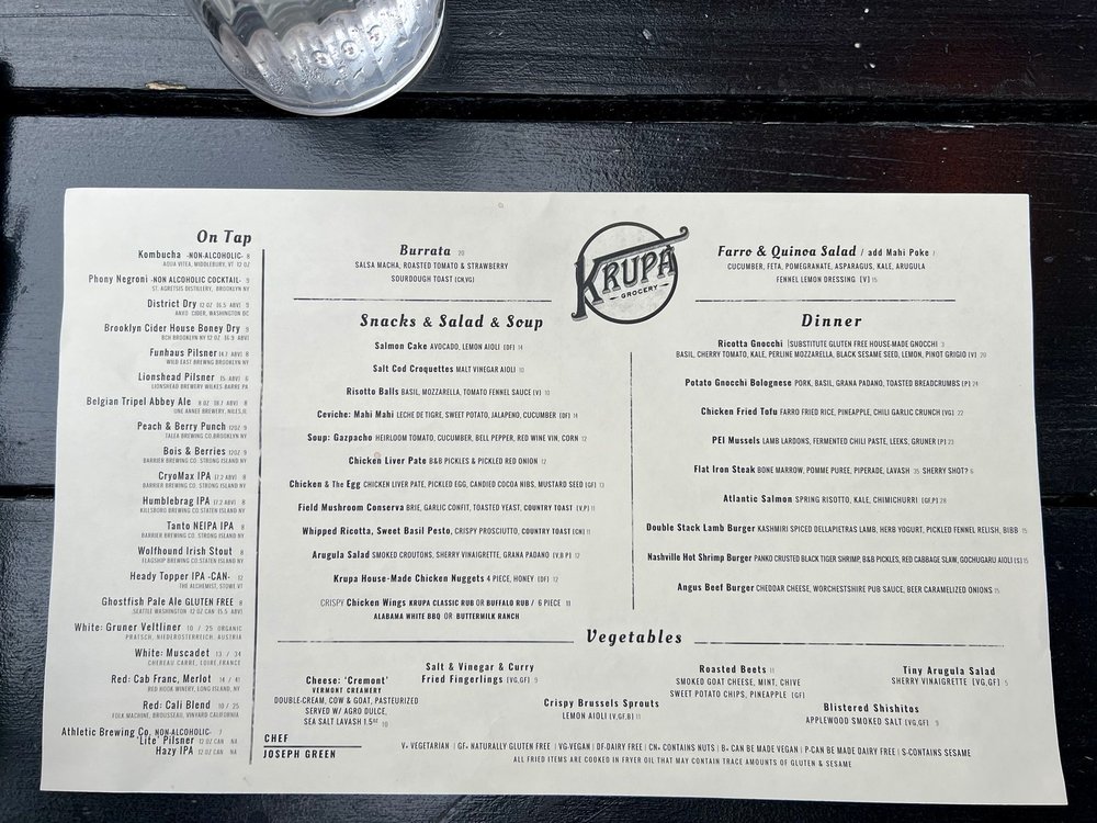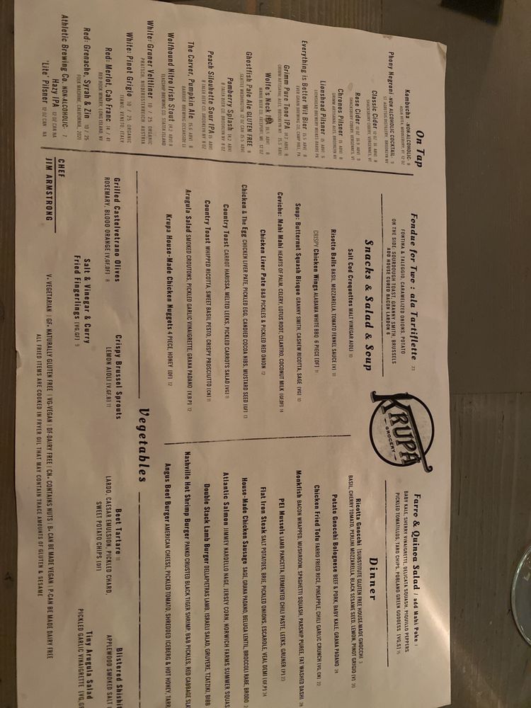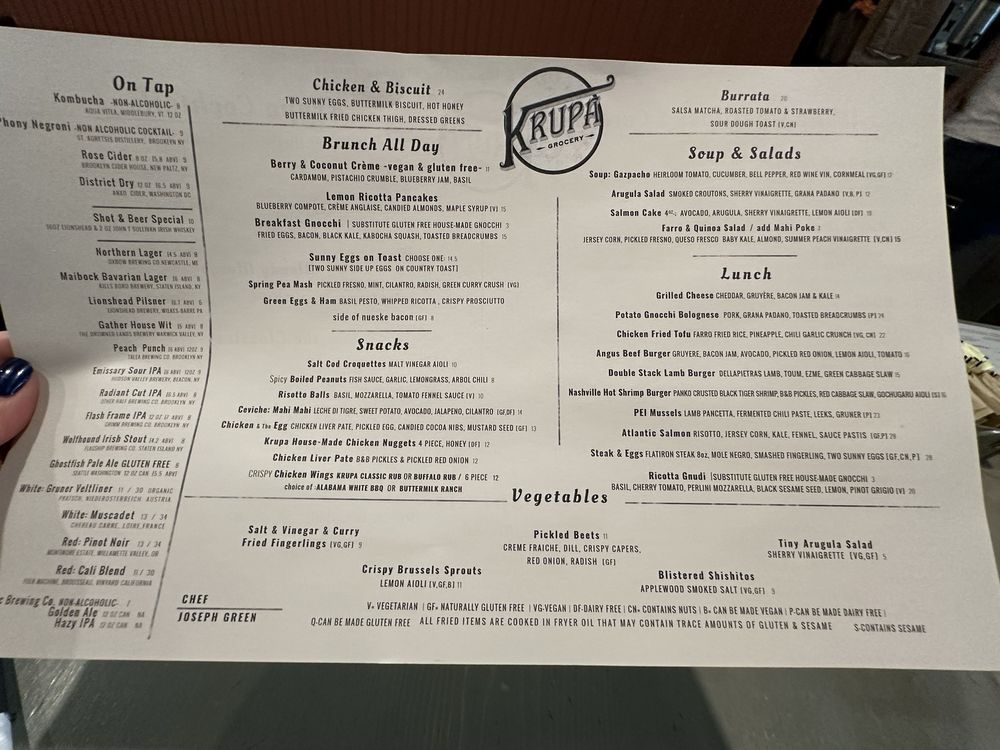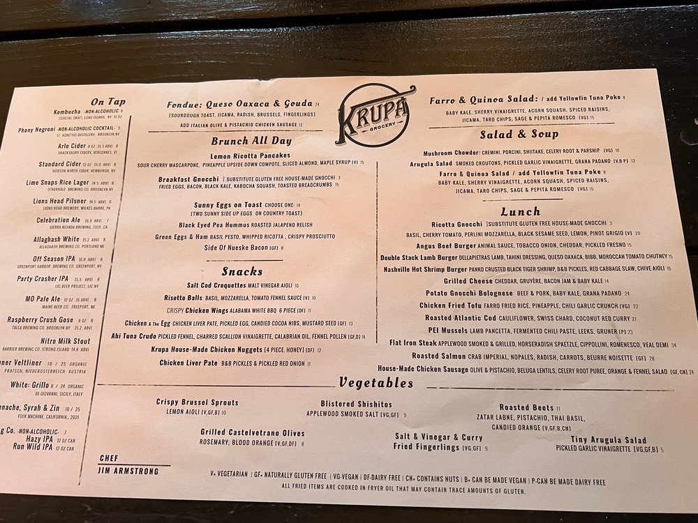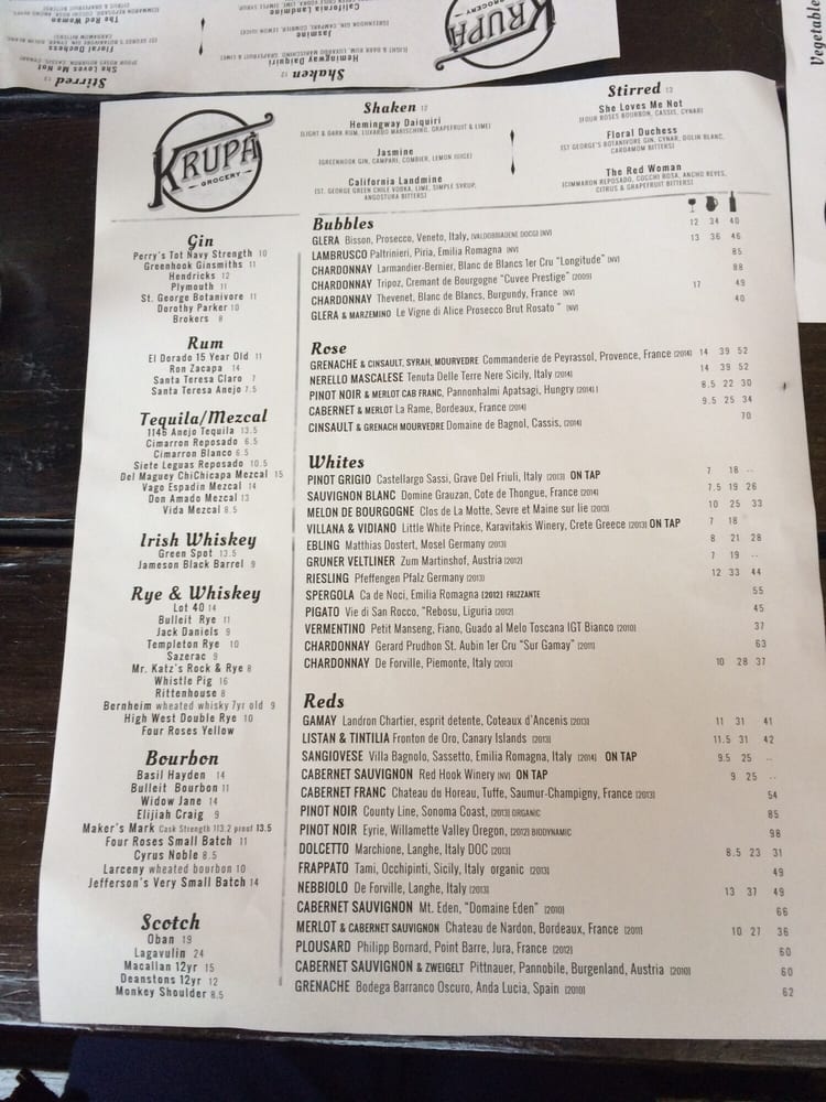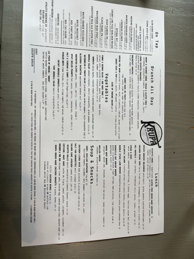 Introducing the menu at Krupa Grocery, a New American restaurant in Brooklyn, NY, offering a diverse selection of dishes. From wings and arugula salad to gnocchi, shrimp burgers, and lamb burgers, the options are both delicious and inventive. Customers praise the fresh ingredients and unique twists on menu staples, highlighting favorites like the chicken fried tofu and farro. The cozy yet cool atmosphere, outdoor patio, strong cocktails, and diverse dessert menu are also mentioned as standouts. With a focus on quality and creativity, Krupa Grocery provides a memorable dining experience for brunch, lunch, and dinner. Don't miss the breakfast gnocchi, a pillowy delight topped with eggs bene toppings and hollandaise - a must-try dish according to many reviews. Visit for a casual lunch, a date night, or a gathering with friends and experience the flavors and warmth of this neighborhood gem.